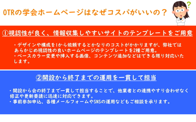 Office OTRでは、学会運営の経験、知識を生かして『コスパがいい』『運営事務局の負担を軽減する』ホームページ制作、運用を提供しています。