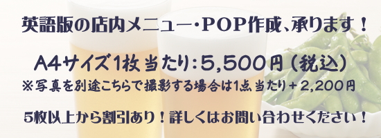 | POP・メニュー製作 | 3営業日~7営業日 | A4・1枚3,300円 (写真などをご用意いただける場合) |